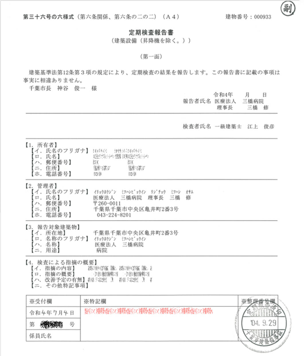 - 国土交通省の定期報告制度の資格者である一級建築士が毎年・隔年の定期調査・検査報告業務を継続して行います